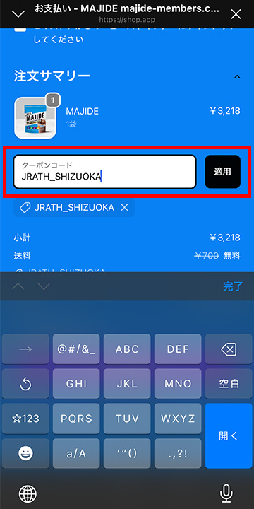 クーポンコードの欄に「JRATH_SHIZUOKA」と記入し、
